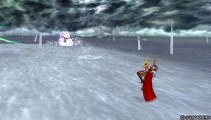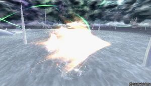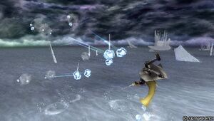 The projectile stays for over a second, and then sends out several ice shards at opponent. The mid priority remains active until the ice shards come out, but blocking it can cause this projectile to send ice shards towards Kefka instead [2].